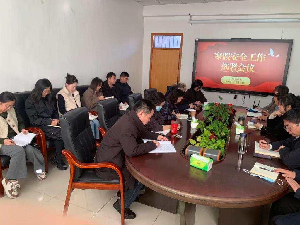 2025年12月25日,外国语学院召开专题会议,传达上级关于校园安全稳定的指示精神,分析当前风险挑战,并就期末与寒假期间安全稳定工作进行研究部署。学院党政领导班子、全体行政人员及辅导员参会。