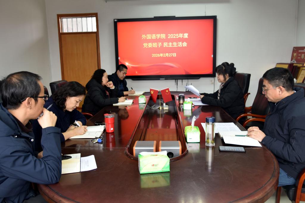 2月27日下午,按照校党委统一部署,外国语学院领导班子召开2025年度民主生活会。学院党委书记仇静莉主持会议,院长张润、副书记刘磊、副院长张艳、杨清珍参加会议。
