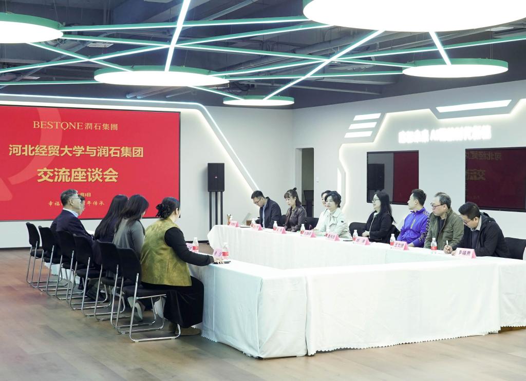 参观结束后,双方举行座谈交流。润石集团党总支副书记刘健致欢迎辞,介绍了集团总体概况、业务布局及党建、人力资源建设成效。河北经贸大学外国语学院党委书记仇静莉代表校方,介绍了学校办学特色、学科优势及人才培养成果,表达了深化校企合作的诚挚意愿。
