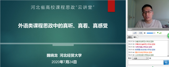 近日,教学评估与教师教学发展中心面向全校教师推送了河北省高校课程思政“云讲堂”系列培训(2020年7月20-26日)活动,全校19个单位的200余位教师参加了培训。7月24日,中心推荐的我校外语教学部教师魏晓龙在培训中做了“外语类课程思政中的真听、真看、真感受—《大学英语》课程思政实践”经验分享。近2000位河北省高校教师在线收看。