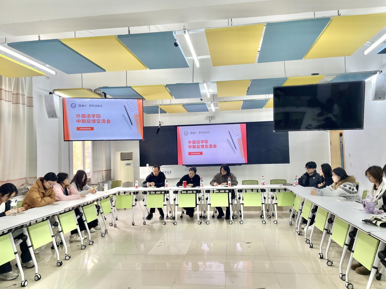 10月30日下午,外国语学院召开了2025年秋季学期“外国语学院圆桌π——中期反馈交流会”。学院副书记刘磊、副院长张艳、教务办公室工作人员、本科生与研究生各班学生代表参加了活动,活动由张艳主持。