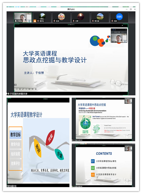 于佳慧老师首先从中国传统文化根基、当代社会现实需要和大学英语学科特点三方面分析了大学英语课程思政的重要意义;然后以具体课程单元为案例,介绍了在思政元素挖掘等方面的感想,并依托参赛经历分享了评委对课程思政教学设计的一些建议。于老师解读了《高等学校课程思政建设指导纲要》等文件,强调了结合中国方案对于英语课程思政开展的重要意义,为英语教师准确把握课程思政根本原则,有效开展课程思政提供了诸多启发。